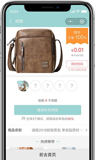 微拼團(tuán)是商品營(yíng)銷和售賣的一種方式,通過(guò)社交關(guān)系鏈分享傳播,可自由設(shè)置開團(tuán)人數(shù),開團(tuán)價(jià)格。用戶在分享時(shí),小程序上實(shí)時(shí)顯示當(dāng)前的拼團(tuán)信息,比如已經(jīng)有多少人參與,價(jià)格是多少等。
